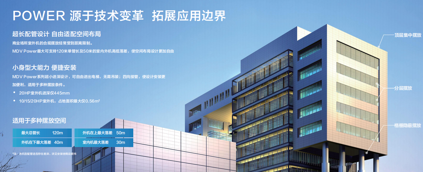 美的MDV Power系列輕型商用空調(diào),POWER系列,源于技術(shù)變革,拓展應(yīng)用邊界,超長配管設(shè)計 自由適配空間布局。