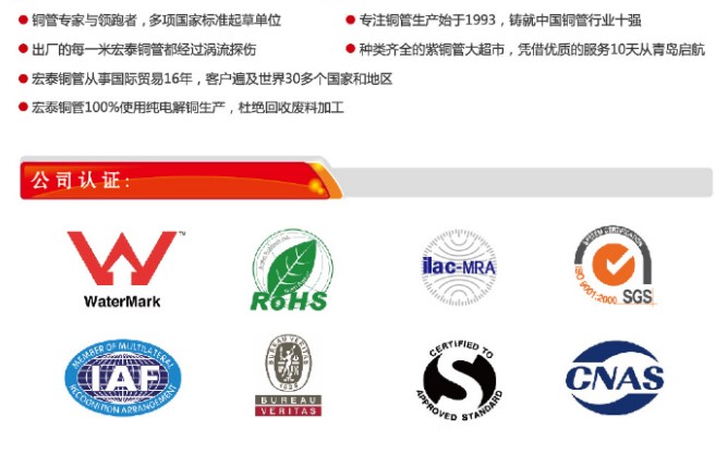 宏泰從1993年開始一直專注于紫銅管系列產(chǎn)品的研發(fā)和生產(chǎn),是高精度清潔R410A銅管、給排水銅管、內(nèi)螺紋銅管、蚊香型盤管、醫(yī)療氣體用銅管、外徑54毫米以上大口徑銅直管、暖氣片銅管、保溫銅管、覆塑銅水管、毛細銅管等紫銅管的生產(chǎn)專家和領跑者,宏泰銅管被廣泛應用于空調(diào)主機,中央空調(diào)或多聯(lián)機空調(diào),冰箱、冰柜,太陽能,散熱器,導電,健康飲用水、地暖安裝工程,醫(yī)療器械廠和造船廠等。